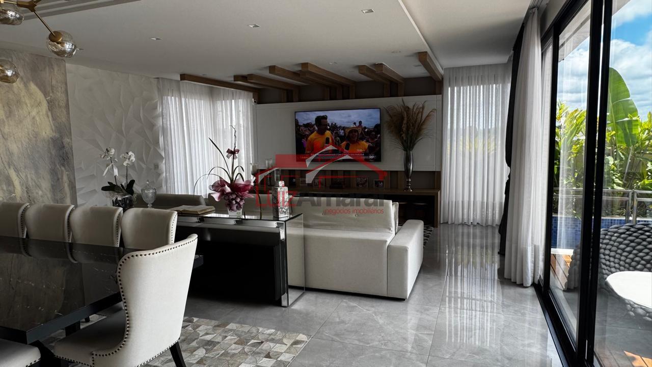 Acabamentos: Todos os ambientes com móveis planejados e móveis avulsos, quadros e decorações e cortinas, metais DECA (Dourado, Rose Gold) piso porcelanato 1mx1m Portobelo na parte interna e Portinari na área externa, 2 centrais de aquecedores a gás com pressurizador, 3 caixas d'água, madeiramento da cobertura em Sucupira preto e forro aparente no piso superior; laje com acabamento em Gesso nos outros pisos, nos quartos piso vinílico, cobertura com telhado shingle, iluminação decorativa em todos os ambientes, portas marítimas laqueadas, puxadores e fechaduras
